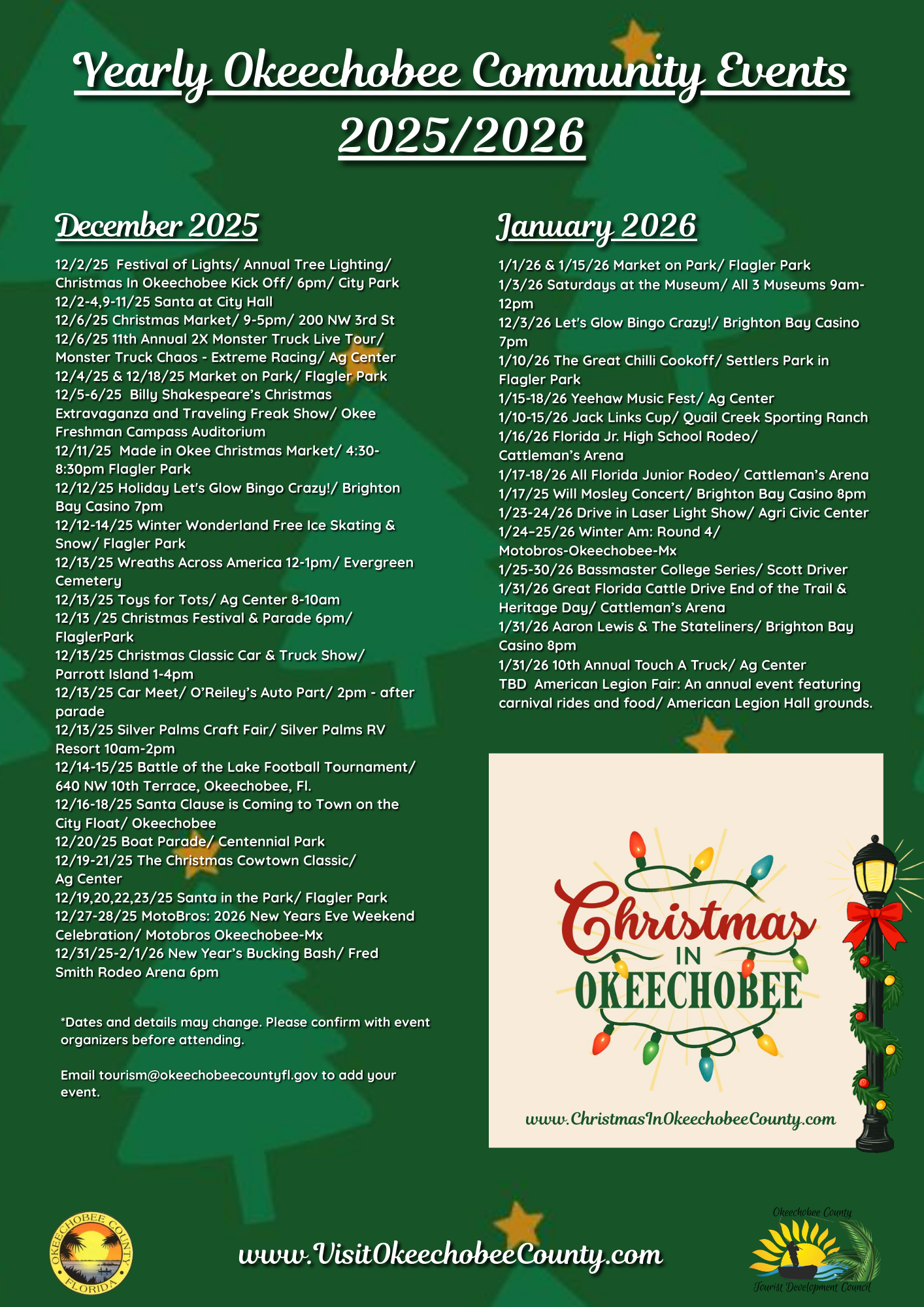 As the calendar year comes to a close no Okeechobee year is complete without the annual Christmas Festival and Parade. No better way to really feel the spirit of the holidays. This event hosted by Okeechobee Main Street is the second weekend of December with a wealth of vendors ready to make your holidays one to remember with beautifully unique gift ideas. Holiday music fills the air along with childhood laughter! Don’t forget to stroll along Park Street and view the wonderful displays by the businesses. Then the finale, the lighted night parade featuring the one and only Santa Claus! Mark your calendar and we will see you there!