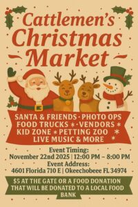 Get ready for a holly jolly day of holiday fun at the Cattlemen’s Christmas Market on November 22, 2025, from 12 PM – 8 PM in Okeechobee, FL!
